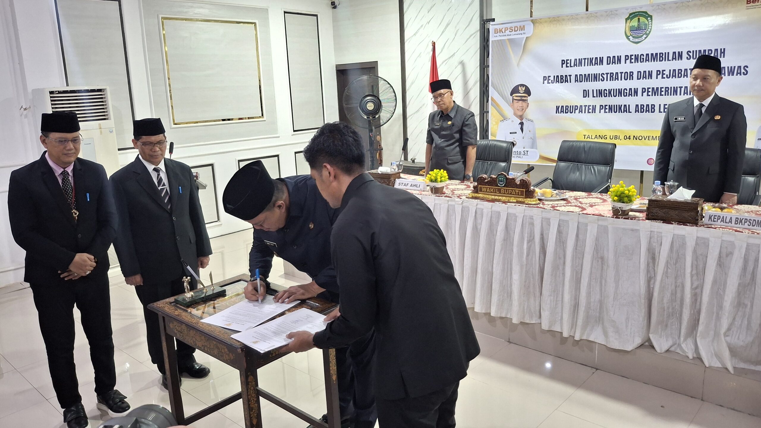 PALI,JS – Pemerintah Kabupaten Penukal Abab Lematang Ilir (PALI) melalui Badan Kepegawaian dan Pengembangan Sumber Daya Manusia (BKPSDM) melaksanakan pelantikan serta pengambilan sumpah jabatan bagi pejabat administrator dan pengawas di lingkungan Pemerintah Kabupaten PALI, Selasa (4/11/2025).